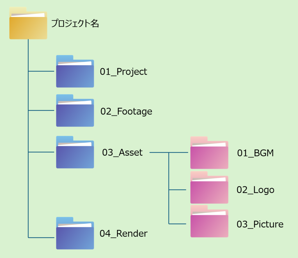 - ・03_Asset : BGM、ロゴ、イラスト、写真など、動画以外の素材を整理して保存。