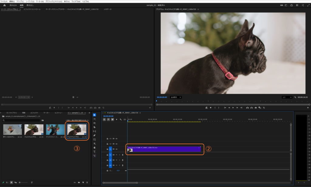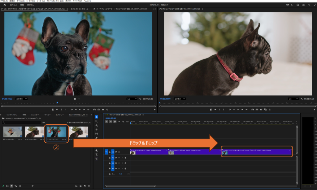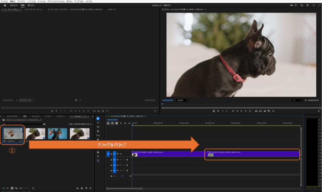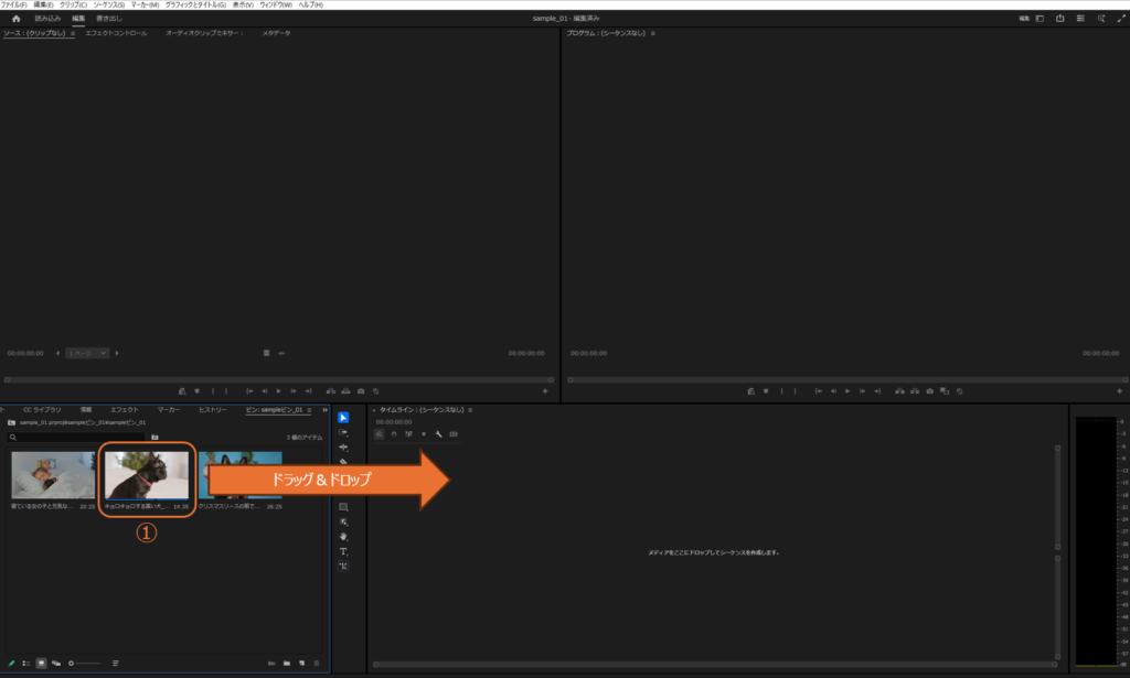 ①プロジェクトパネルに読み込んだ素材を選択し、タイムラインパネルにドラッグ&ドロップします。