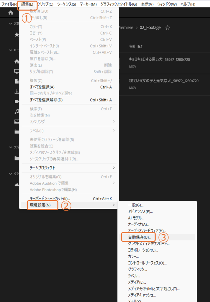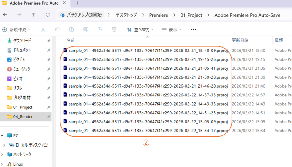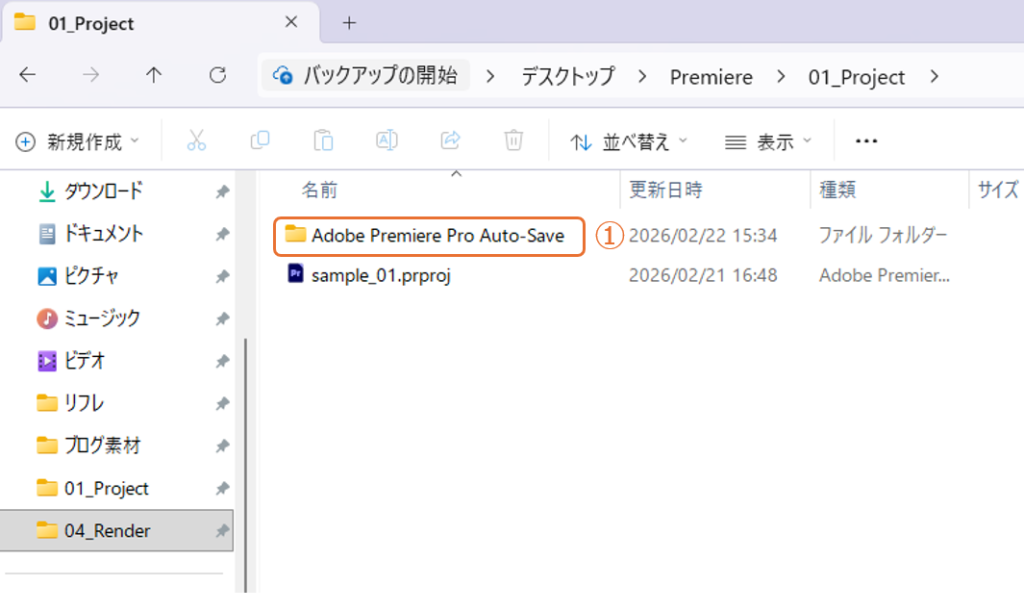 ①プロジェクトデータを保存しているフォルダ内(ここでは「01_Project)に、「Adobe Premiere Pro Auto-Save」というフォルダが自動で作成されます。