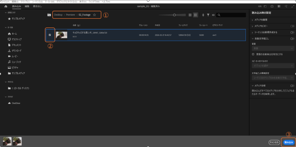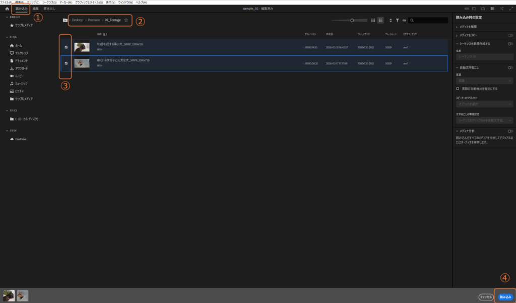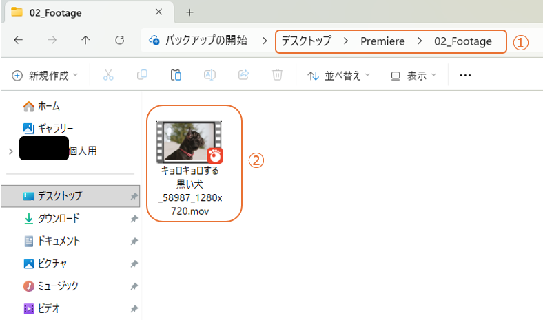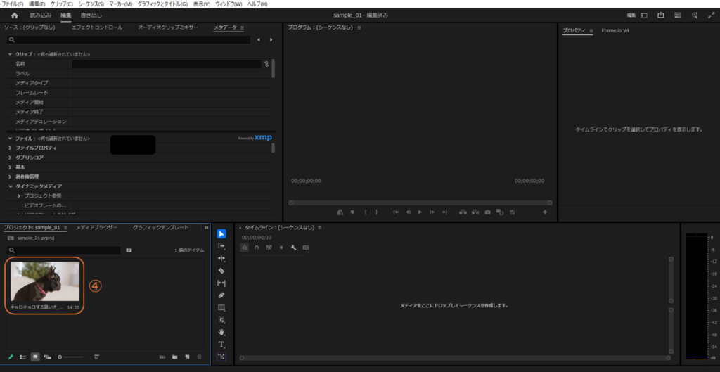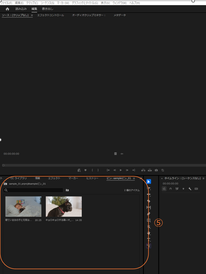 ⑤「プロジェクト」パネル内に、素材が読み込まれました。