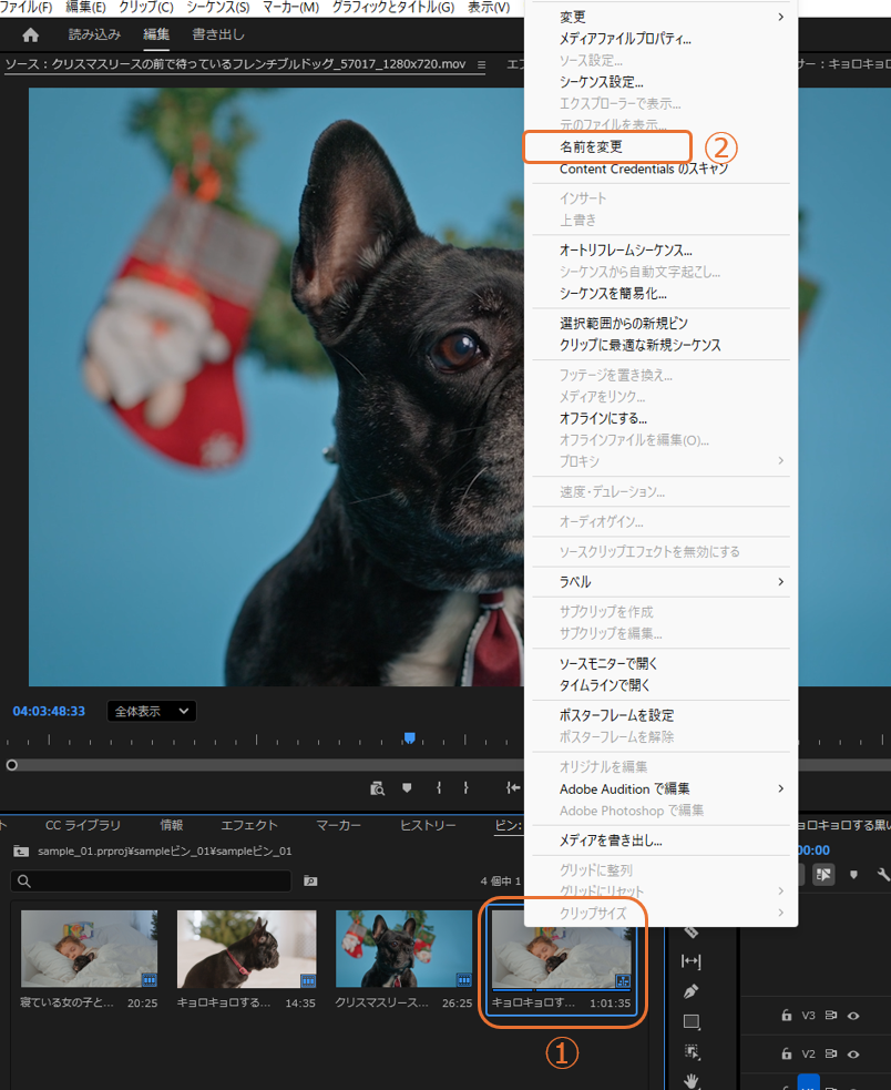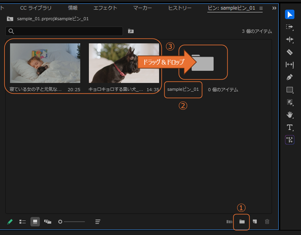 ①「プロジェクト」パネル内の「新規ビン」をクリックします。