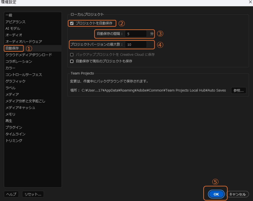 ④「プロジェクトバージョンの最大数」を設定します。自動でバックアップファイルが作成される個数です。初期設定は20になっていますが多すぎるので私は10にしています。