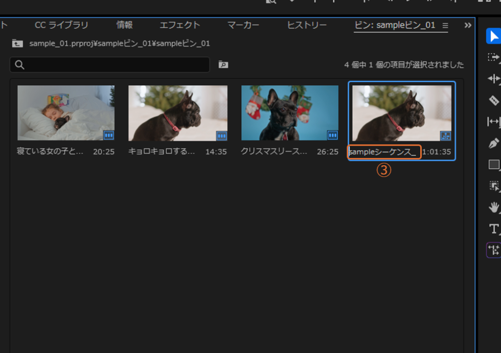 ③プロジェクトパネルには「シーケンスクリップ」が作成されます。