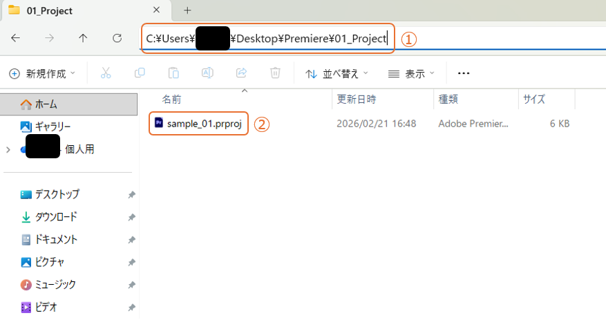 ②プロジェクトファイルが生成されていることを確認します。※拡張子「prproj」