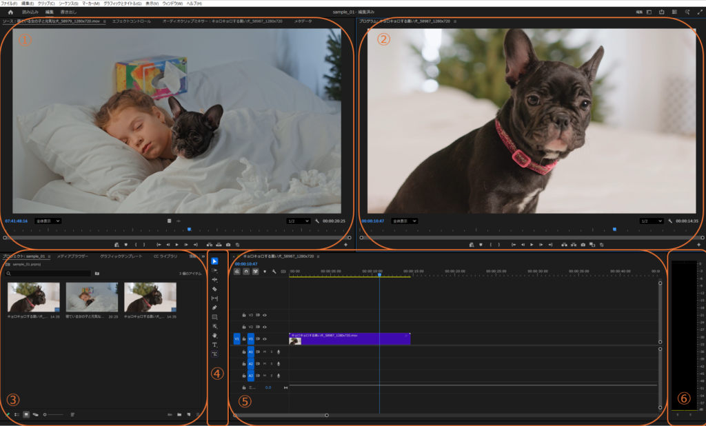 ③「プロジェクト」パネル: 読み込んだ素材(クリップ)を管理する場所。
