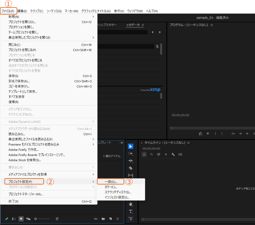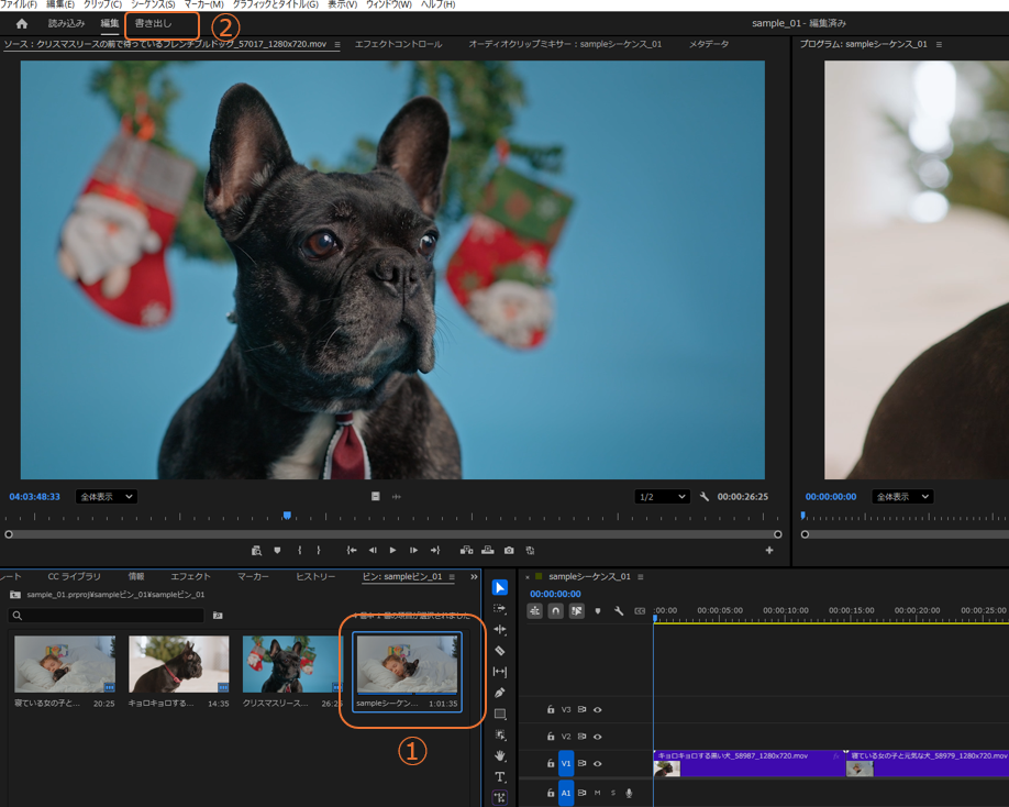 ①編集画面のプロジェクトパネルで、書き出したいシーケンスを選択します。
