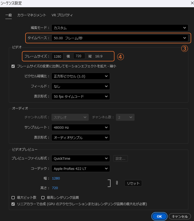 ③「タイムベース」・・・映像の「1秒あたりのフレーム数(フレームレート)」を指します。映像の種類によって適正値が変わってきます。