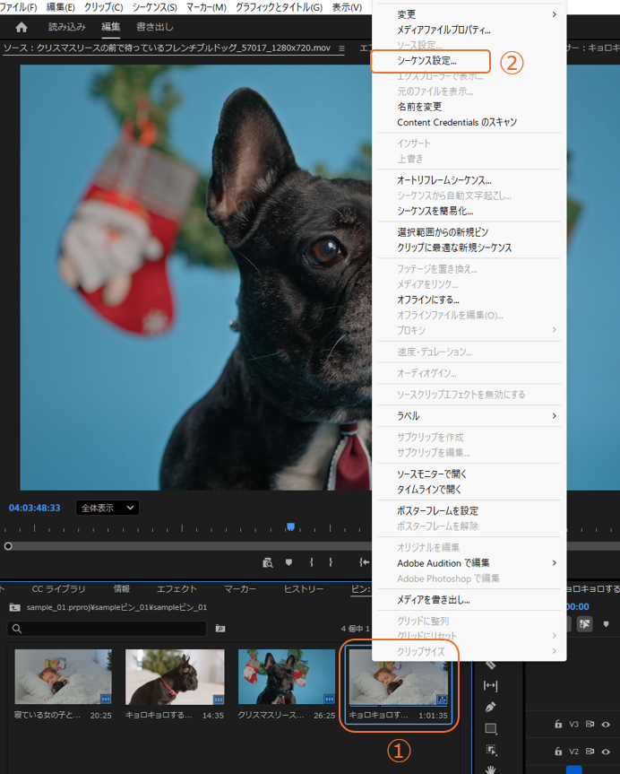 ②「シーケンス設定」を選択すると、シーケンス設定が開きます。