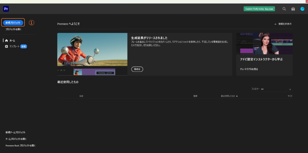 ①Premiereを起動し、「新規プロジェクト」ボタンをクリックします。