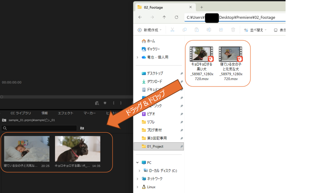 ①次に、2つ目のクリップとして、プロジェクトパネルから別の素材を選択し、タイムラインパネルの1つ目のクリップの後ろにドラッグ&ドロップして結合させます。