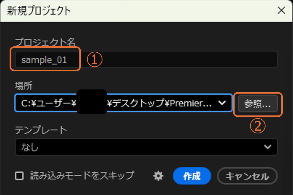 ②「参照」をクリックして、プロジェクトの保存先を設定します。